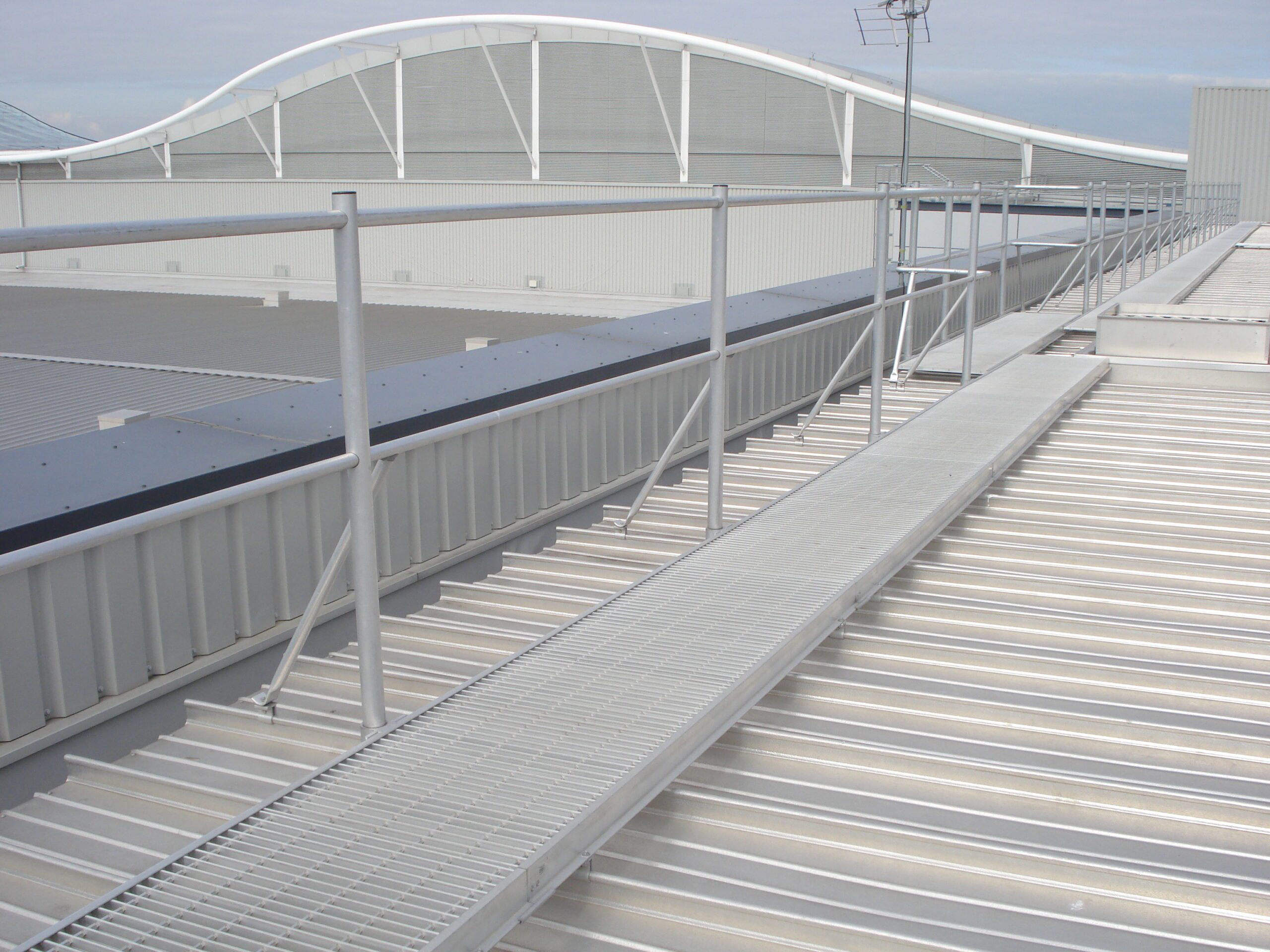 If the roof is flat, then non-slip mats or grating panels may be sufficient as long as falls from the roof perimeter are prevented by simple edge protection arrangements (e.g. a secure guardrail and toeboard around the edge). However, if there is a degree of the sloping roof structure is not flat then a full roof access walkway solution is required.
