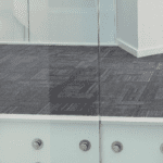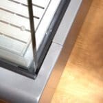 The integrated rubber seal is pictured here, within the floor channel. It insulates the structural glass.