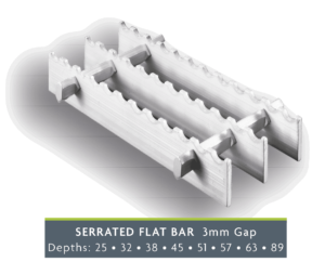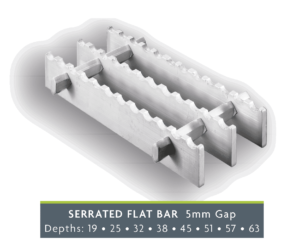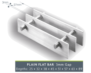 Flat Bar is an open grille type flooring that utilises our traditional rectangular load-bearing bars which are secured into position by our unique swage locking process. They have a surface contact area of 10.6% (3mm Flat Bar) or 16% (5mm Flat Bar) and are available In 3.2mm and 4.8mm widths.