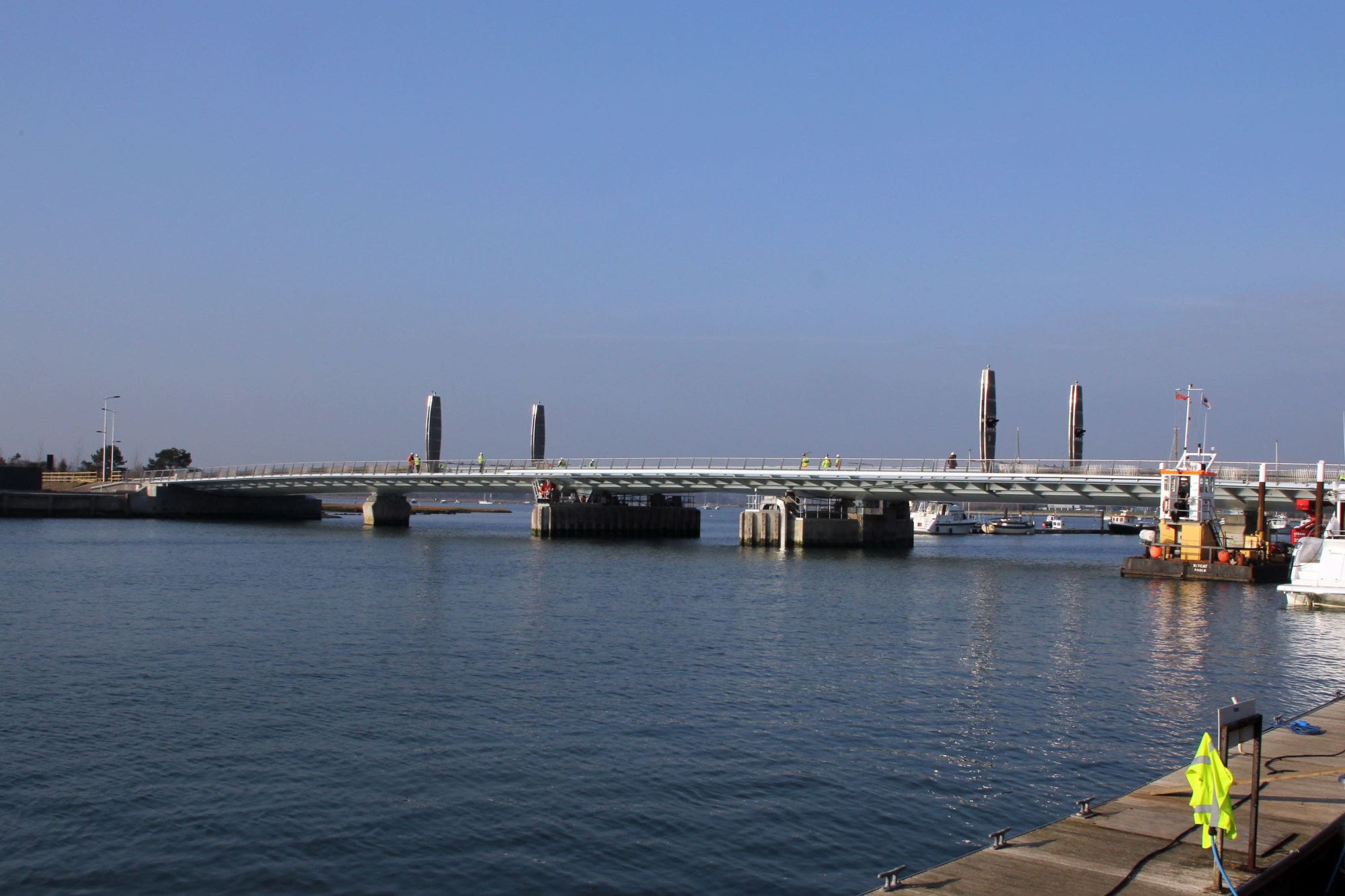 Configured as a simple bascule, the joint between the bridge’s two hydraulically lifted sections is skewed across a flat deck, creating two triangular sail shapes that cross as they rise and come to rest in an overlapping composition, mirroring the shape of racing yachts passing through the bridge. Techdek grillage has been installed on both sail sections which form a sculptural piece when lifted into a vertical position.